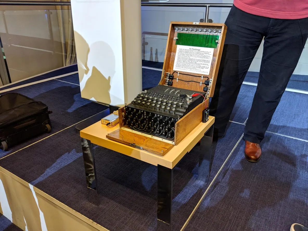 We ate dinner before heading back into the challenge room for a whirlwind tour of cryptography. We learnt about various ciphers and heard the story of acquiring an Enigma Machine! Turns out, German border guards don’t really like you trying to leave with one, but it all worked out in the end and this machine ended up in a museum in Bletchley.